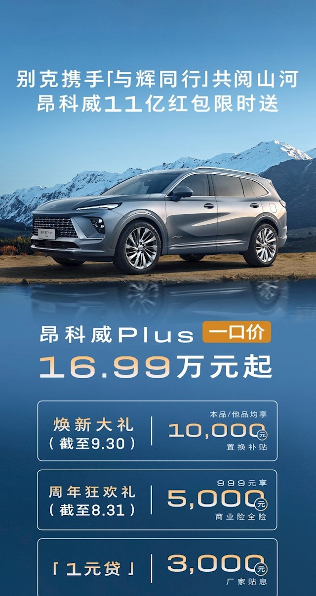 2025年9月30日前购买别克昂科威 Plus可享一口价16.99万元起, 在现有一口价基础上,本品/他品置换均可享受1万元元品牌置换补贴,并叠加享受至高1万5千元国补。