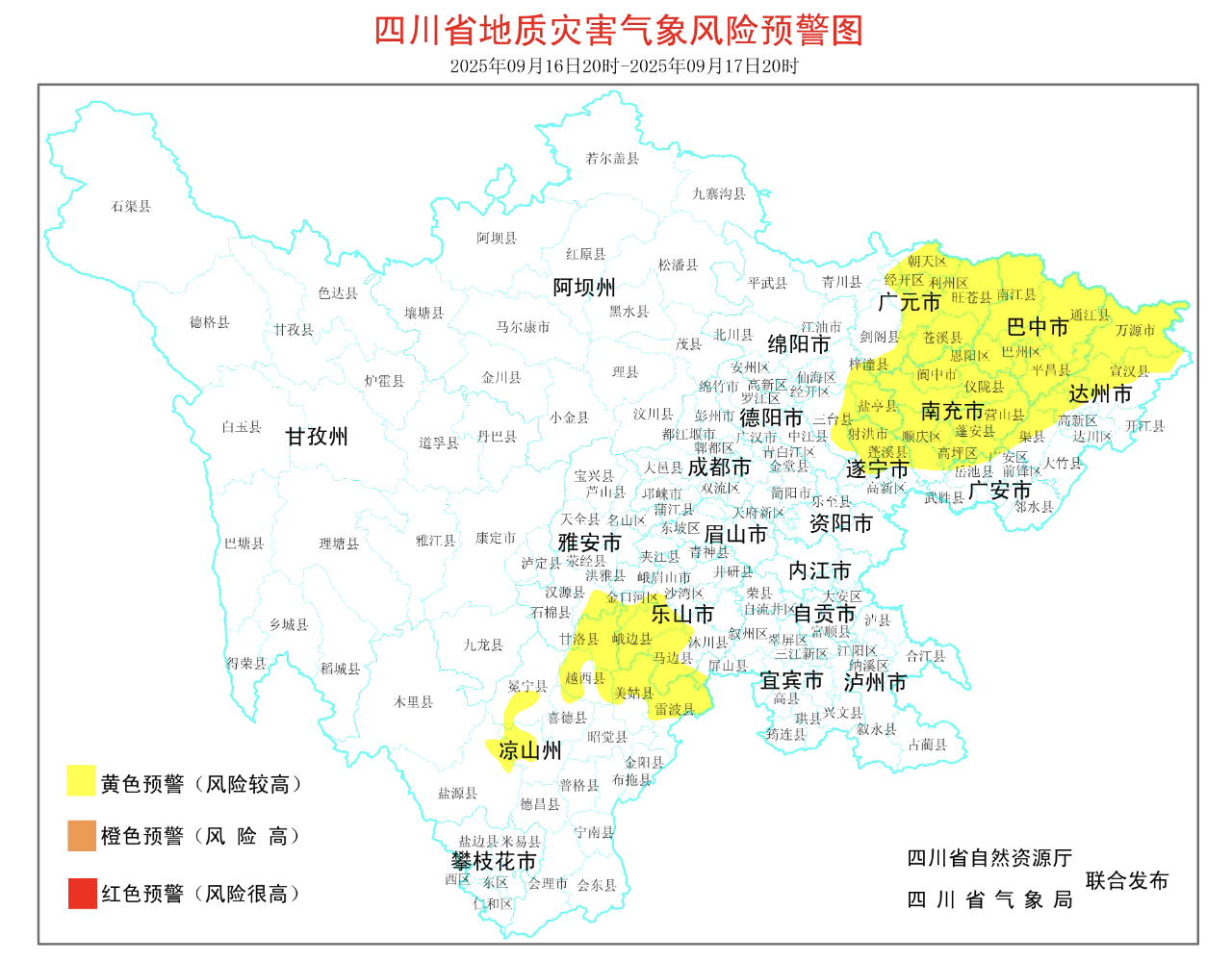 9月16日,四川省自然资源厅、四川省气象局发布9月16日20时至9月17日20时全省地质灾害气象风险预警。